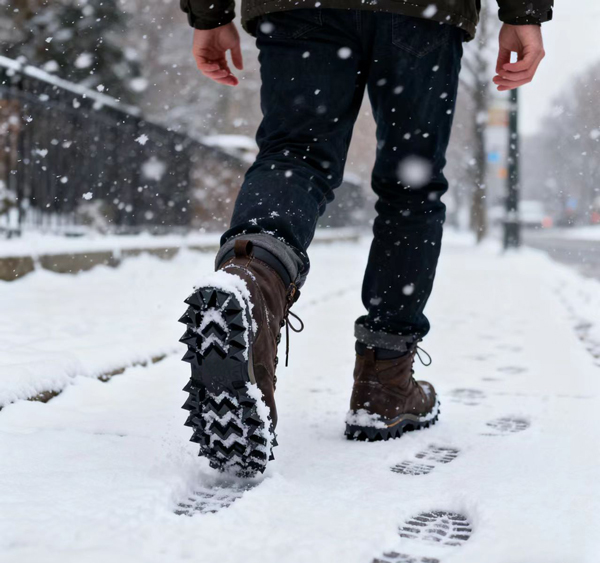 更換防滑鞋:雪天出行建議穿防滑鞋,如帶有深花紋的橡膠底鞋,增加摩擦力。
